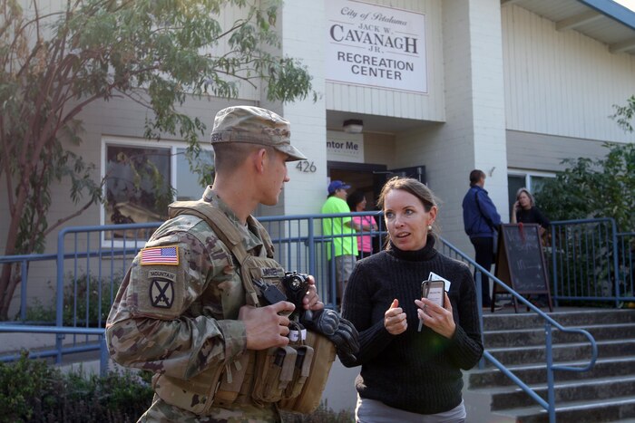 Staff Sgt. Timothy Barrera of the 270th Military Police Company, 49th Military Police Brigade, California Army National Guard, discusses the daily schedule with Deborah L. Dalton, executive director of Cavanagh Recreation Center in Petaluma, California. The center quickly became an evacuation facility for Sonoma County residents affected by the Northern California fires. Barrera’s team provided security as well as other means of helping the evacuees adjust to their new, temporary home. “It’s a blessing to have you people here,” Dalton said about the Guard members. “I love you people so much and I’m a fan.”